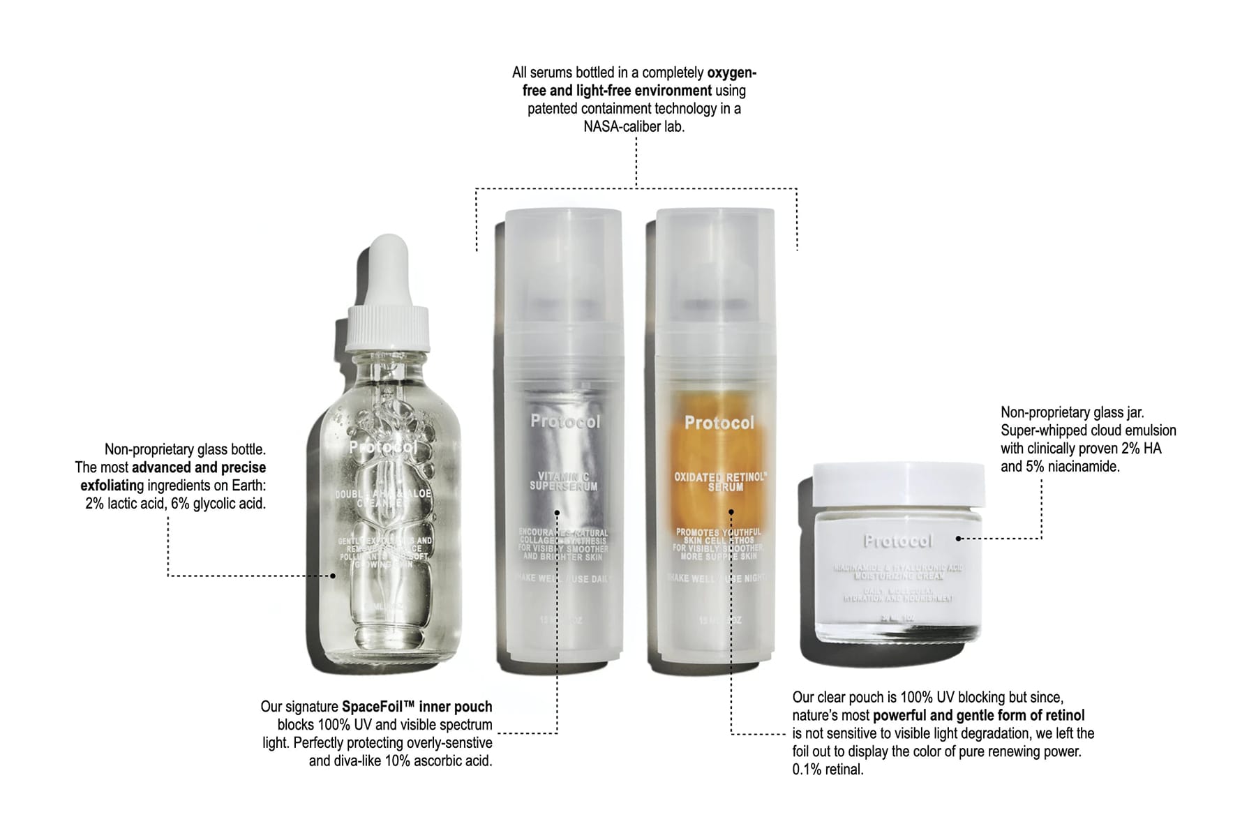 I cant even express to you how much I’ve battled with hormonal cystic acne, dark hyperpigmentation, dry, and oily skin. I’ve spent thousands on peels, creams, serums, pills, and countless sad evenings researching ingredients and how they can alter your skin and gut microbiome. Through the years I’ve had to learn the hard way how paramount clean and well preserved ingredients are. After 13 years of an arduous journey- I’ve landed, with confidence, on Protocol. As we all know, Vitamin C is a cute but unstable monster, retinol is an irritating acid at certain percentages, HA is tricky without the right moisture/reactive combination but Protocol has mastered all of it with scientific sophistication. Aside from its CLEAN (non carcinogenic, paraben free, hormone-disrupter free) ingredients, the packages are ingenious (check out their page on the way no light or air penetrate the serums). Also, their customer care is the sweetest, most understanding, and most responsive I’ve dealt with.